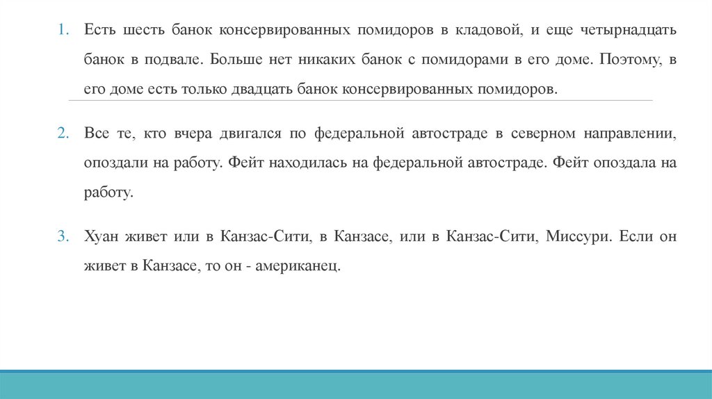 1. Есть шесть банок консервированных помидоров в кладовой, и еще четырнадцатьбанок в подвале. Больше нет никаких банок с помидорами в его доме. Поэтому, в