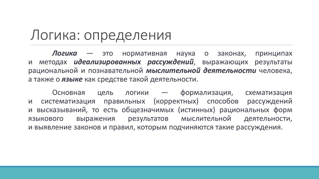 Логика: определенияЛогика — это нормативная наука о законах, принципах