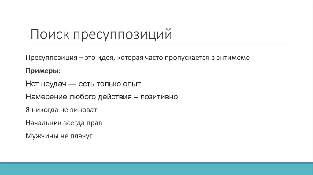 Поиск пресуппозицийПресуппозиция – это идея, которая часто пропускается в энтимеме