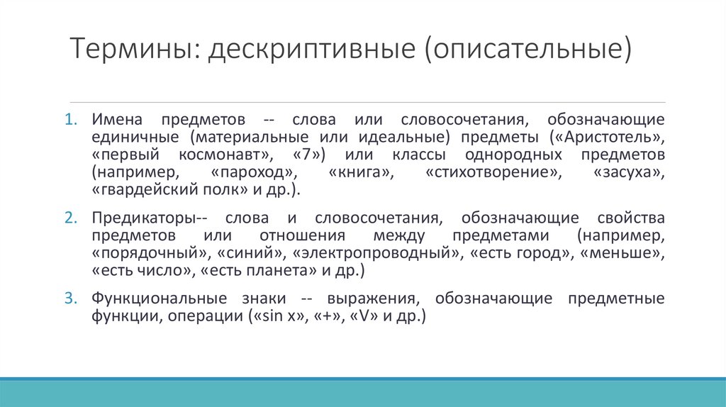 Термины: дескриптивные (описательные)1. Имена предметов -- слова или словосочетания, обозначающие