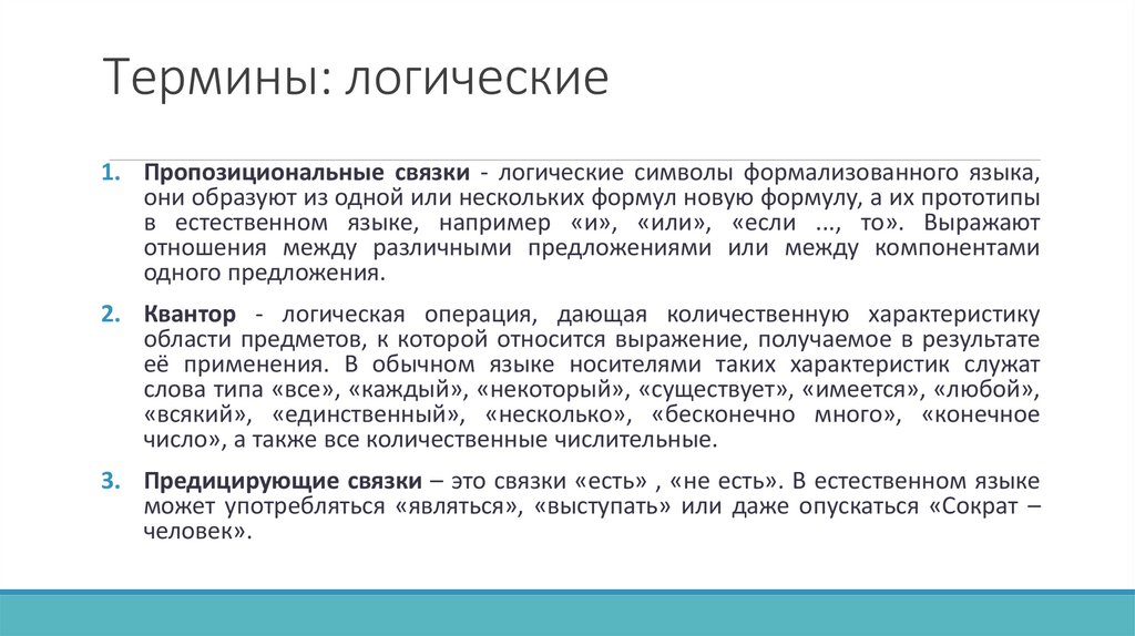 слова типа «все», «каждый», «некоторый», «существует», «имеется», «любой»,