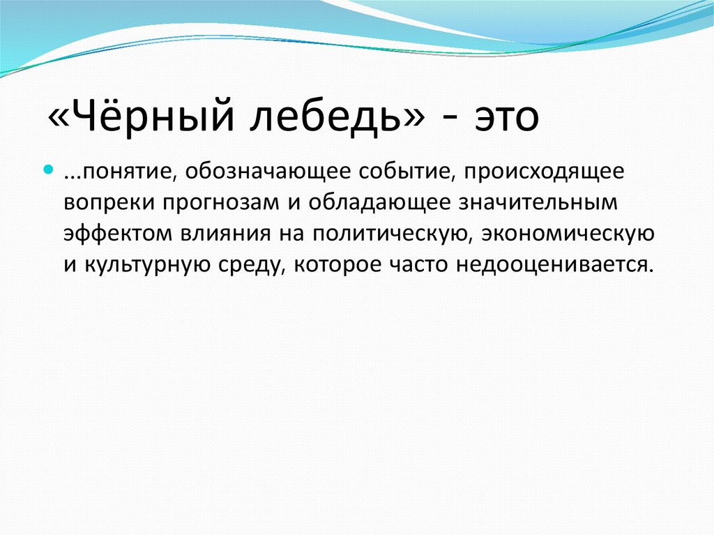 «Чёрный лебедь» - это…понятие, обозначающее событие, происходящее