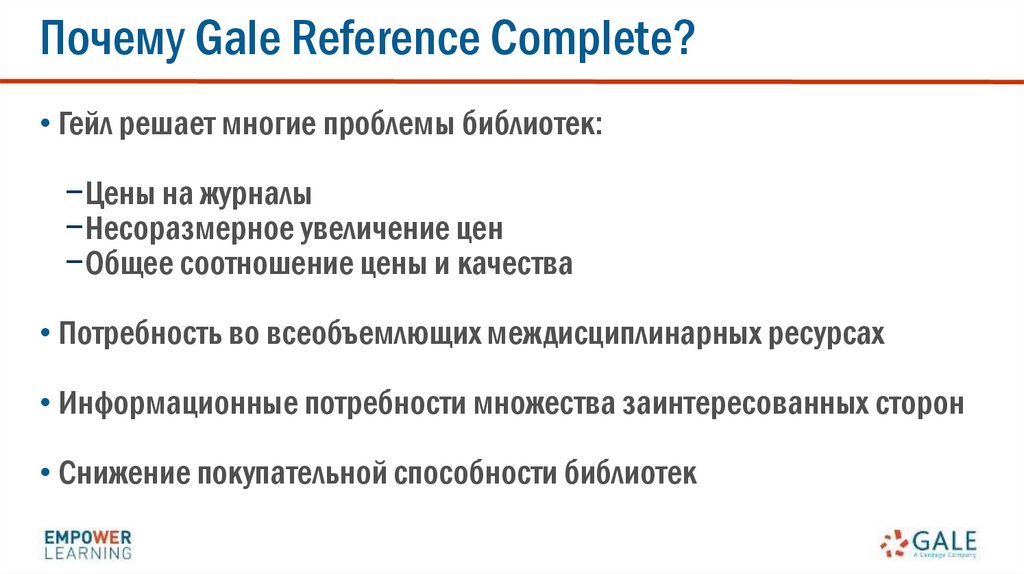 Почему Gale Reference Complete?• Гейл решает многие проблемы библиотек: