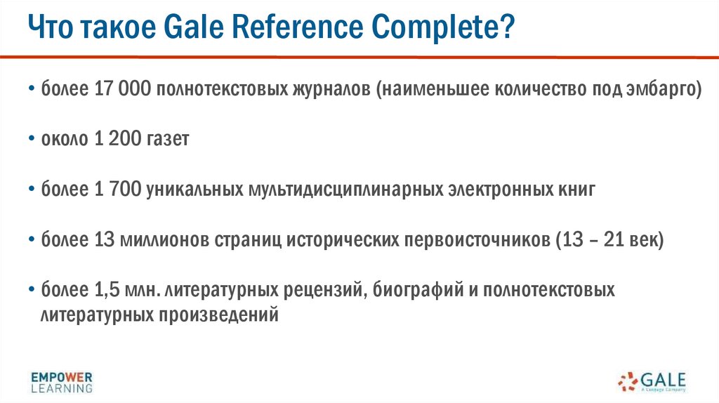 Что такое Gale Reference Complete?• более 17 000 полнотекстовых журналов (наименьшее количество под эмбарго)