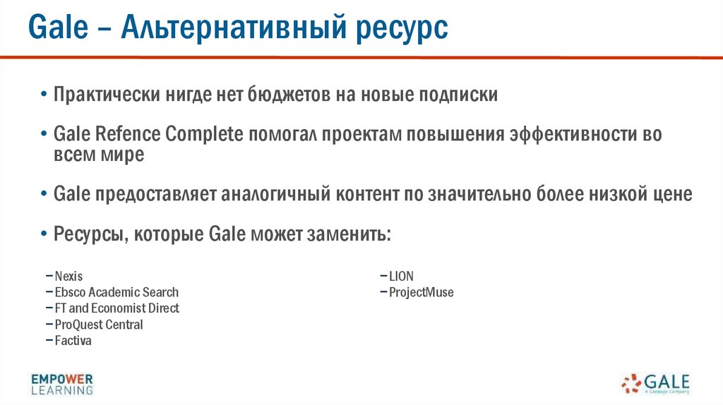 Gale – Альтернативный ресурс• Практически нигде нет бюджетов на новые подписки