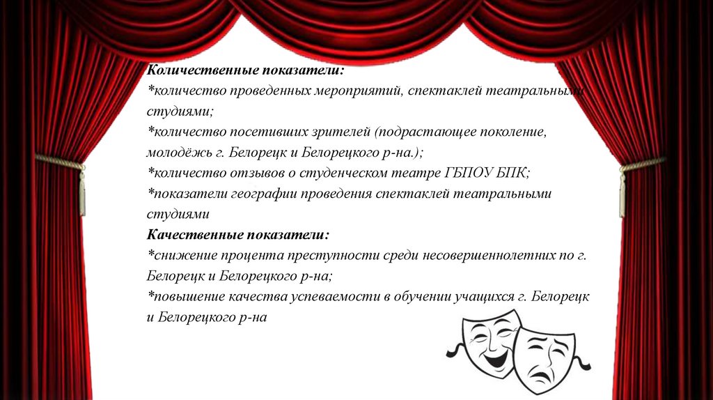 Количественные показатели:*количество проведенных мероприятий, спектаклей театральными