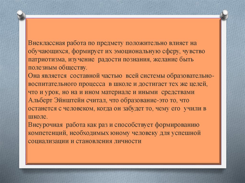 Внеклассная работа по предмету положительно влияет наобучающихся, формирует их эмоциональную сферу, чувство