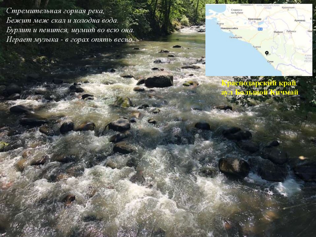 Стремительная горная река,Бежит меж скал и холодна вода.