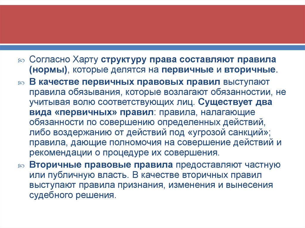 Согласно Харту структуру права составляют правила(нормы), которые делятся на первичные и вторичные.