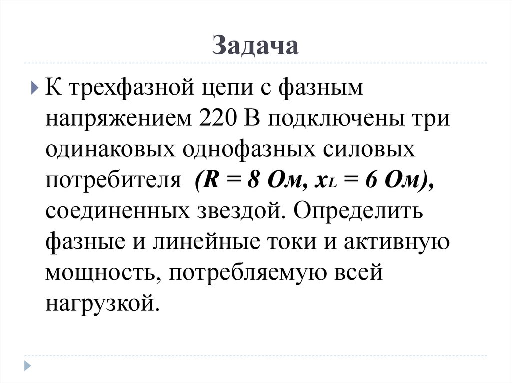 потребителя (R = 8 Ом, xL = 6 Ом),