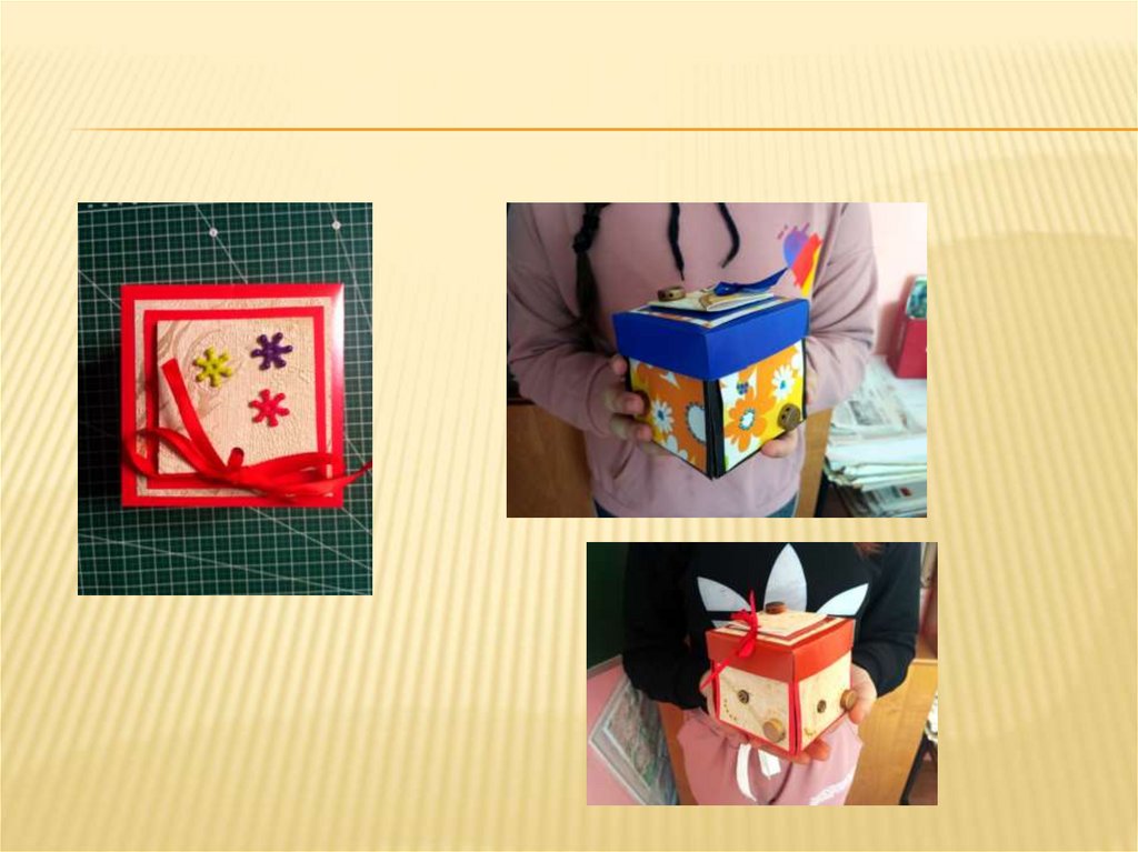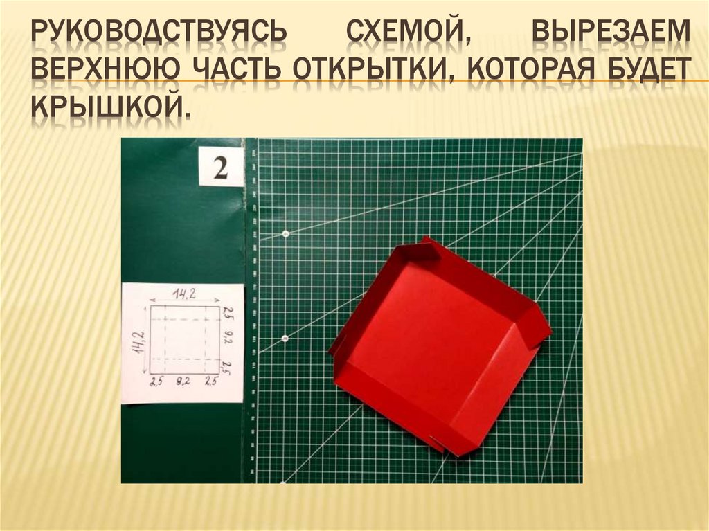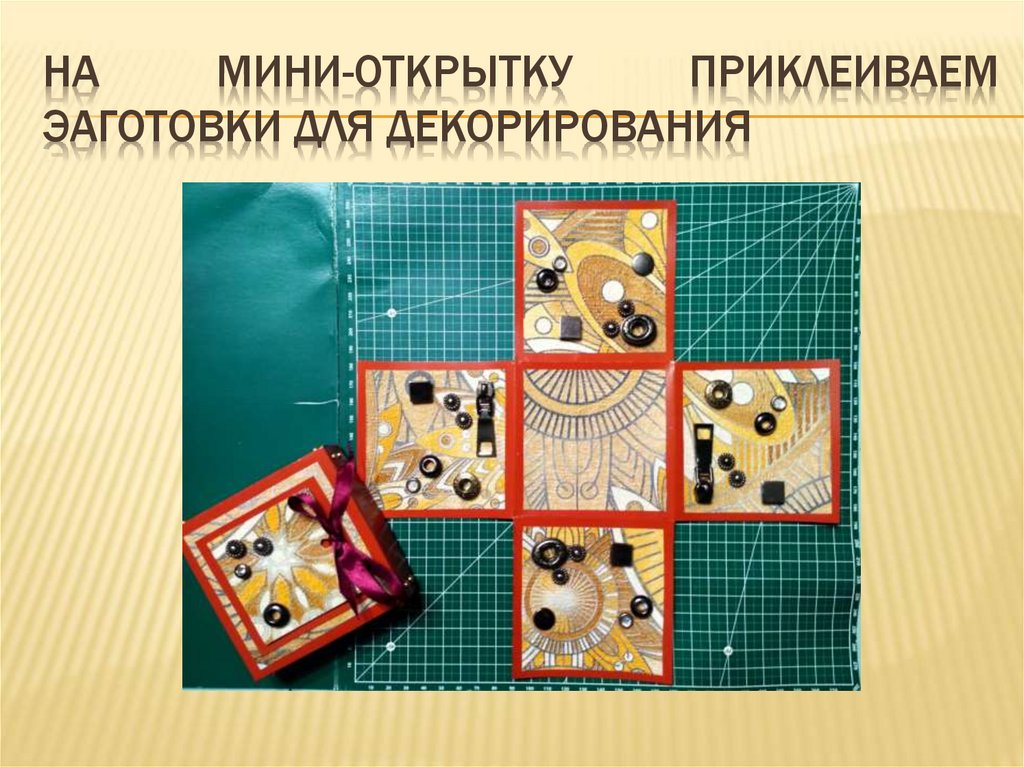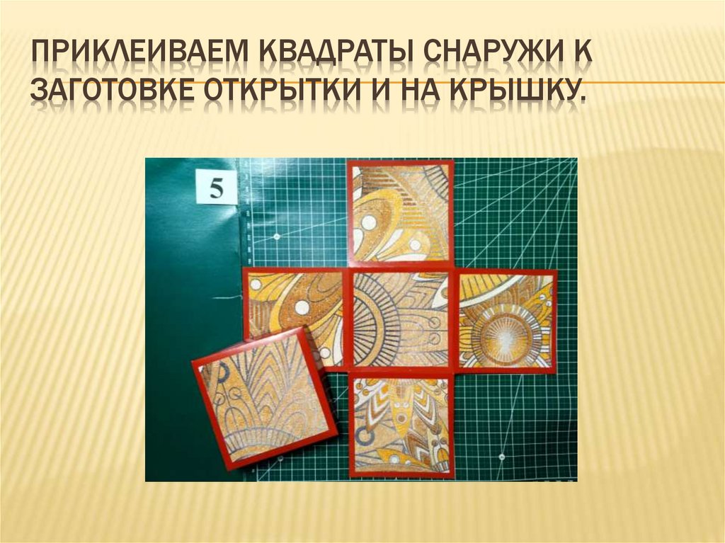 ПРИКЛЕИВАЕМ КВАДРАТЫ СНАРУЖИ КЗАГОТОВКЕ ОТКРЫТКИ И НА КРЫШКУ.
