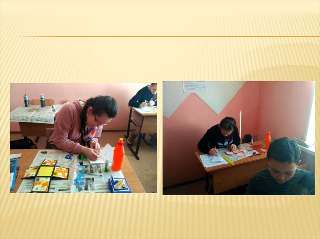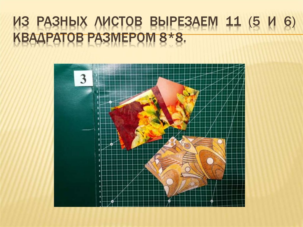 ИЗ РАЗНЫХ ЛИСТОВ ВЫРЕЗАЕМ 11 (5 И 6)КВАДРАТОВ РАЗМЕРОМ 8*8.