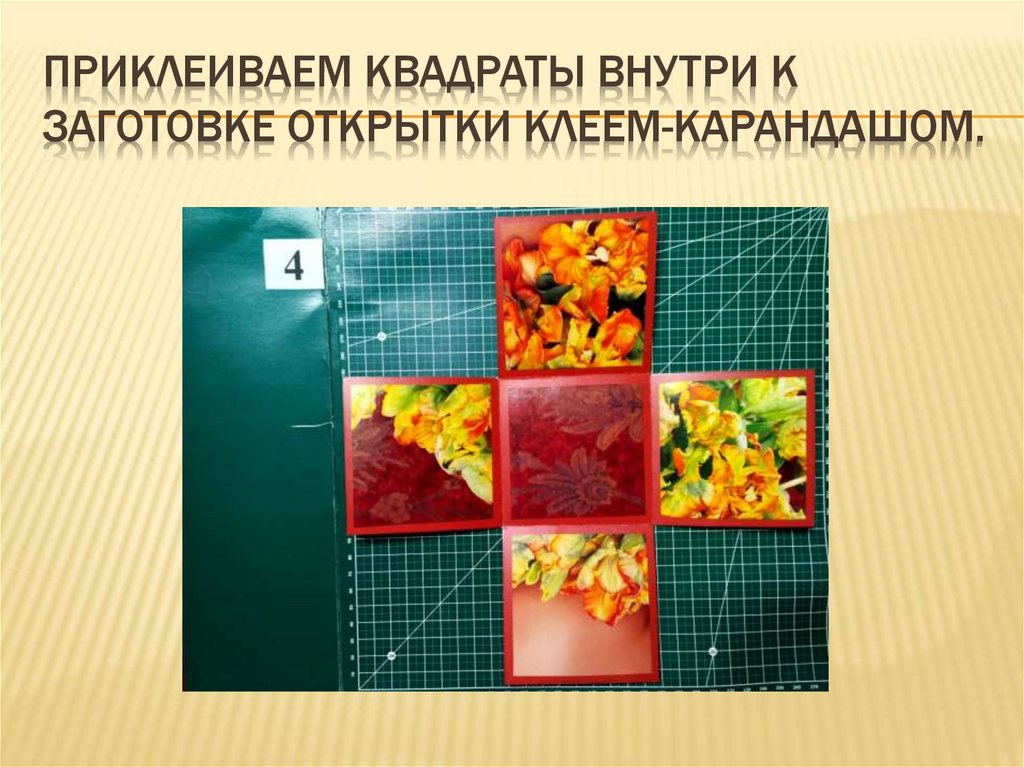 ПРИКЛЕИВАЕМ КВАДРАТЫ ВНУТРИ КЗАГОТОВКЕ ОТКРЫТКИ КЛЕЕМ-КАРАНДАШОМ.
