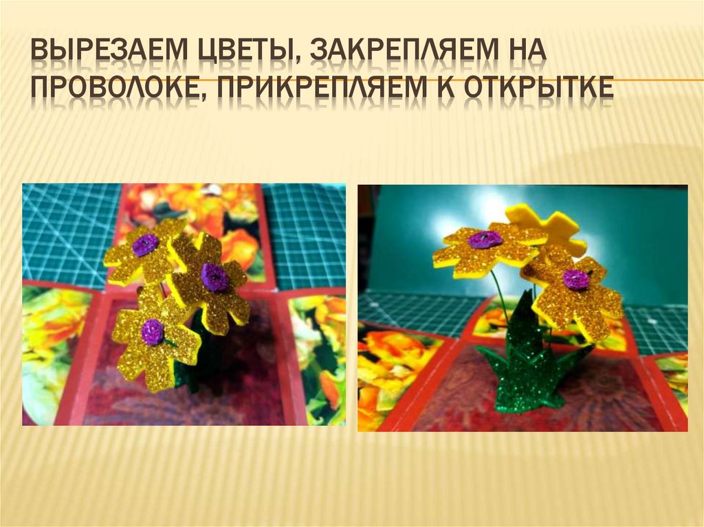 ВЫРЕЗАЕМ ЦВЕТЫ, ЗАКРЕПЛЯЕМ НАПРОВОЛОКЕ, ПРИКРЕПЛЯЕМ К ОТКРЫТКЕ
