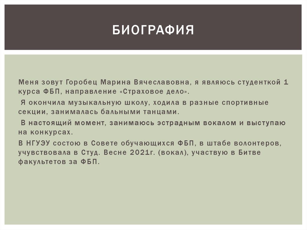 БИОГРАФИЯМеня зову т Горобец Марина Вячеславовна, я являюсь с т уденткой 1