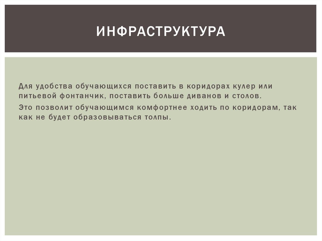 ИНФРАСТРУКТ УРАДля удобс тва обучающихся пос тавить в коридорах кулер или