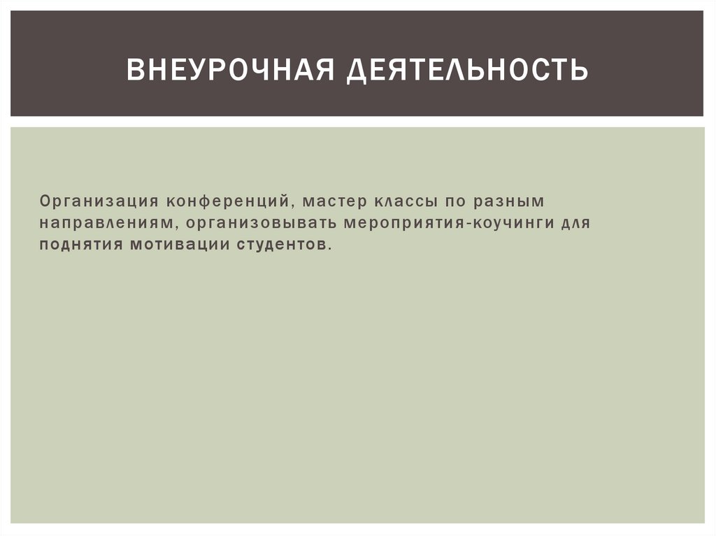 ВНЕУРОЧНАЯ ДЕЯТЕЛЬНОСТЬОрганизация конференций, мас тер классы по разным