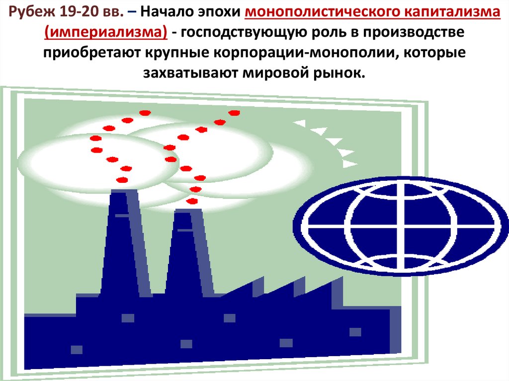 Рубеж 19-20 вв. – Начало эпохи монополистического капитализма(империализма) - господствующую роль в производстве
