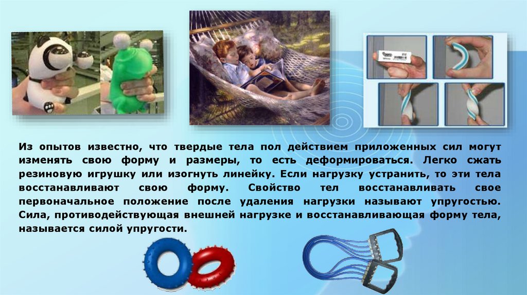 резиновую игрушку или изогнуть линейку. Если нагрузку устранить, то эти тела
