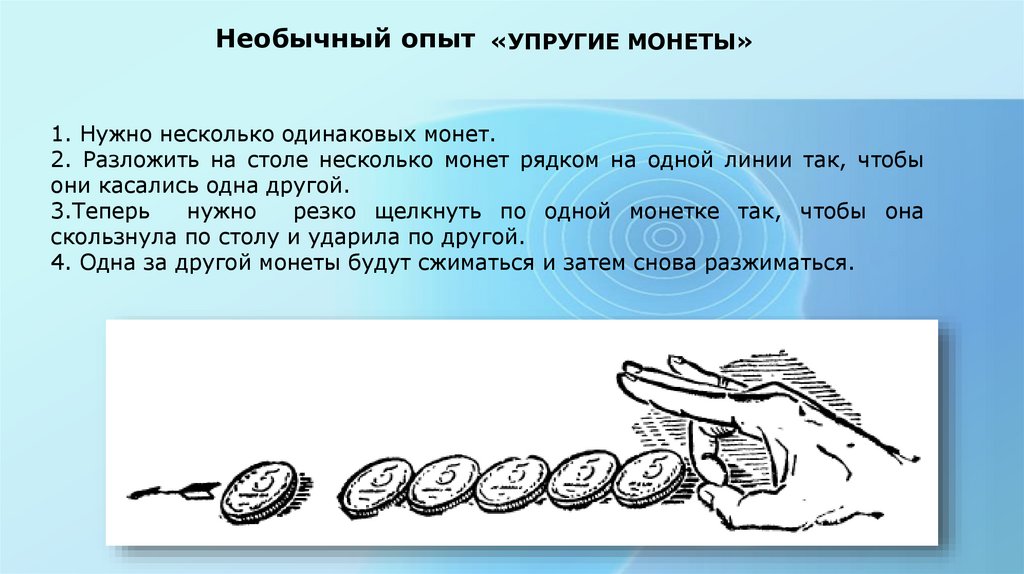 Необычный опыт «УПРУГИЕ МОНЕТЫ»1. Нужно несколько одинаковых монет.