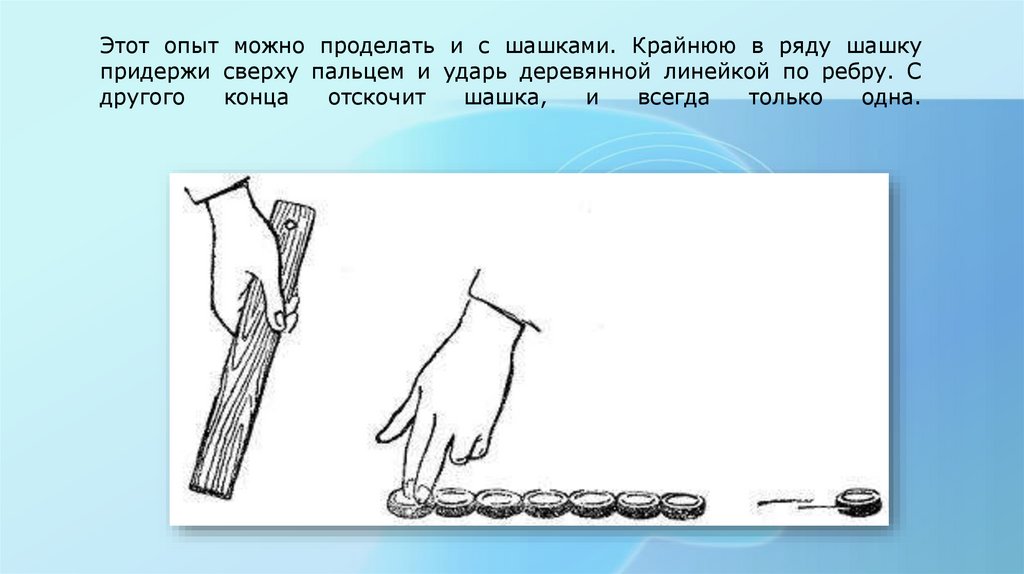 Этот опыт можно проделать и с шашками. Крайнюю в ряду шашкупридержи сверху пальцем и ударь деревянной линейкой по ребру. С
