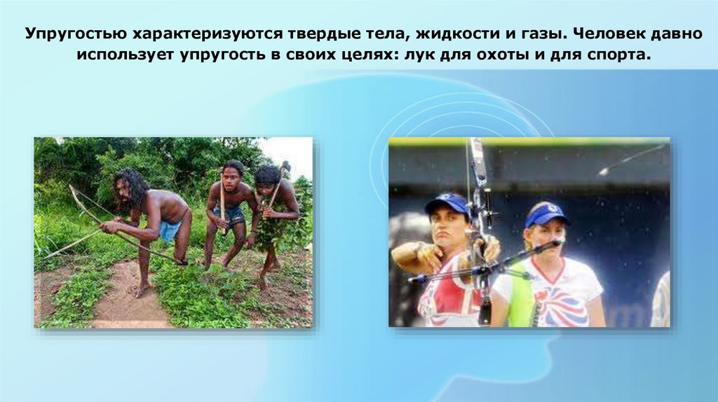 Упругостью характеризуются твердые тела, жидкости и газы. Человек давноиспользует упругость в своих целях: лук для охоты и для спорта.