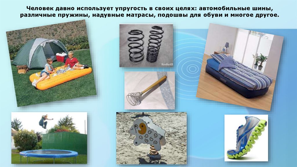 Человек давно использует упругость в своих целях: автомобильные шины,различные пружины, надувные матрасы, подошвы для обуви и многое другое.