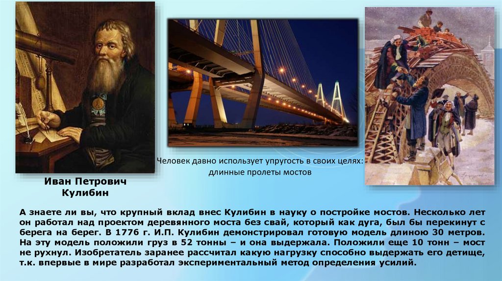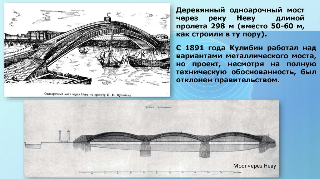 А знаете ли вы, что крупный вклад внес Кулибин в науку о постройке мостов. Несколько лет