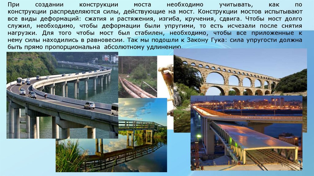 все виды деформаций: сжатия и растяжения, изгиба, кручения, сдвига. Чтобы мост долго