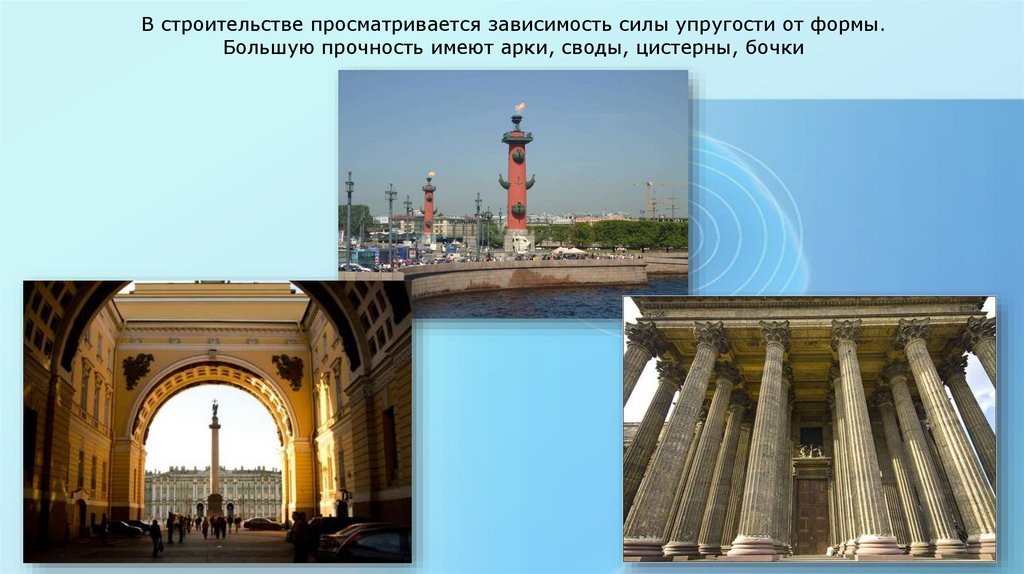 В строительстве просматривается зависимость силы упругости от формы.Большую прочность имеют арки, своды, цистерны, бочки