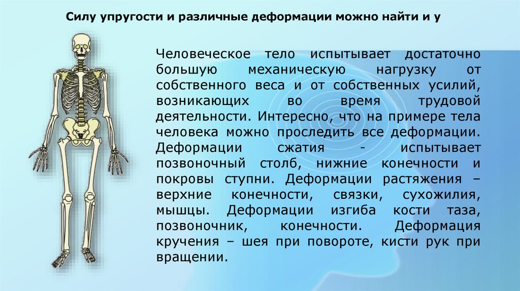 Силу упругости и различные деформации можно найти и уЧеловеческое тело испытывает достаточно