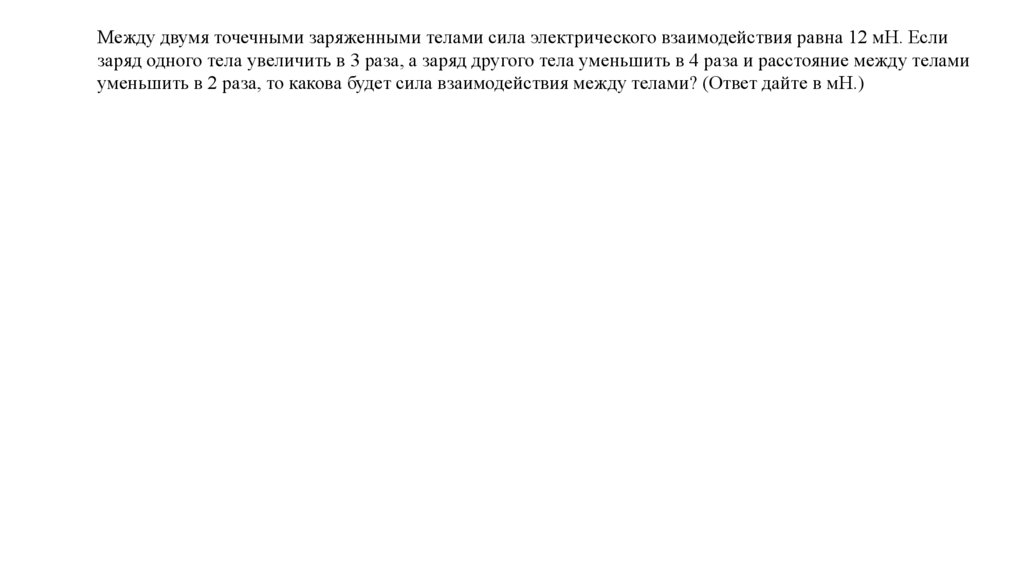 Между двумя точечными заряженными телами сила электрического взаимодействия равна 12 мН. Еслизаряд одного тела увеличить в 3 раза, а заряд другого тела уменьшить в 4 раза и расстояние между телами