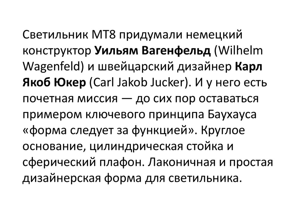 Светильник МТ8 придумали немецкийконструктор Уильям Вагенфельд (Wilhelm