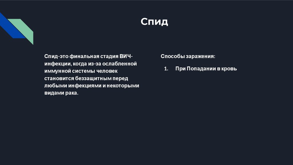 СпидСпид-это финальная стадия ВИЧинфекции, когда из-за ослабленной