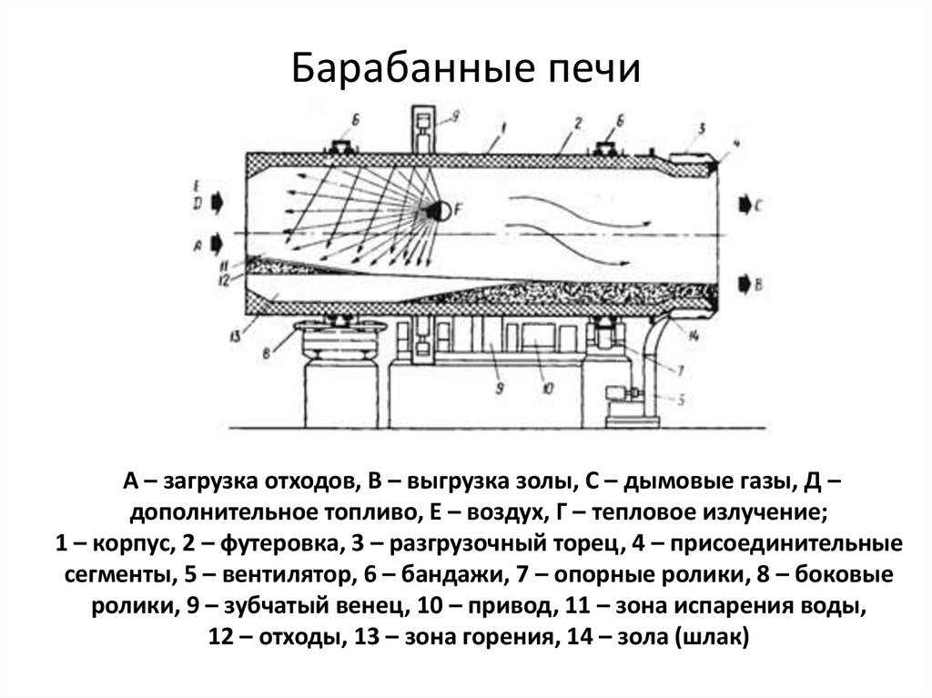 Барабанные печиА – загрузка отходов, В – выгрузка золы, С – дымовые газы, Д –