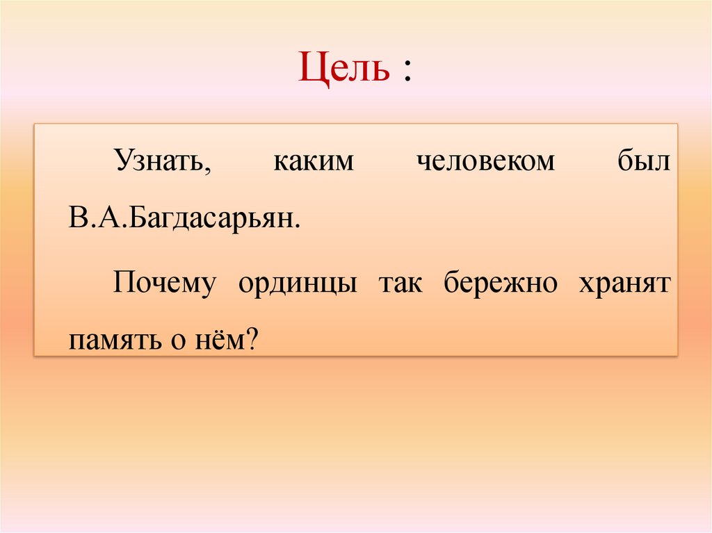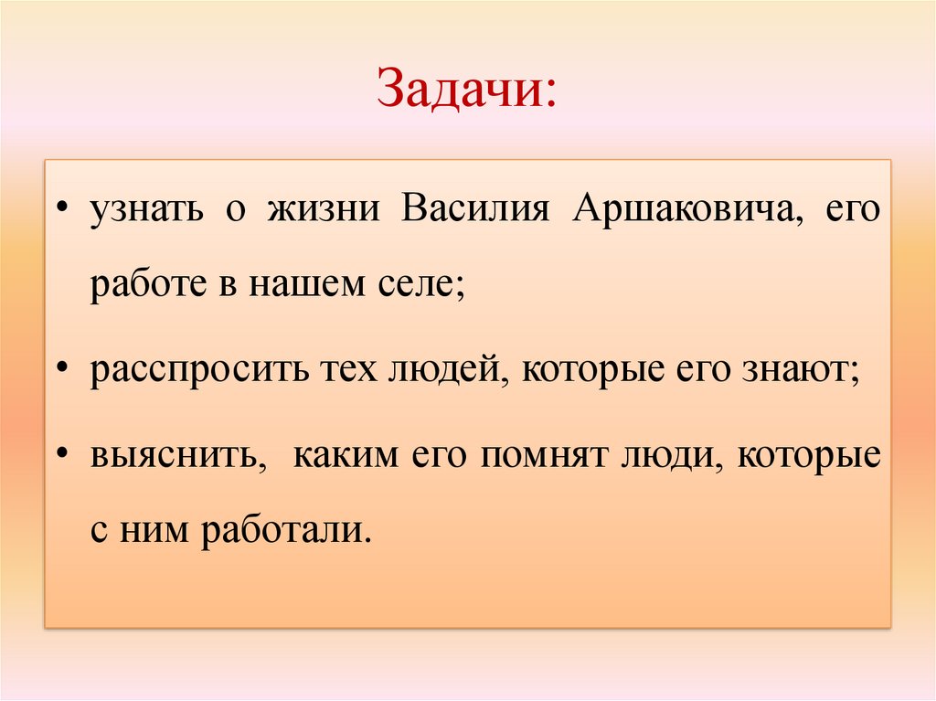 Задачи:• узнать о жизни Василия Аршаковича, его