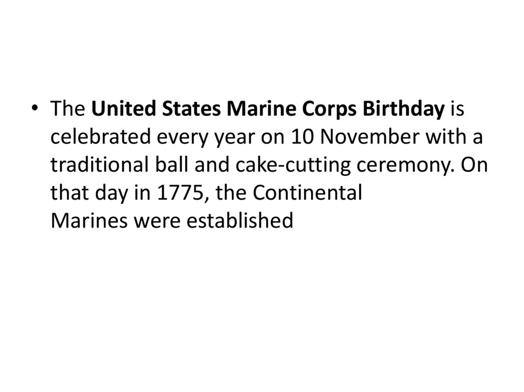 • The United States Marine Corps Birthday iscelebrated every year on 10 November with a