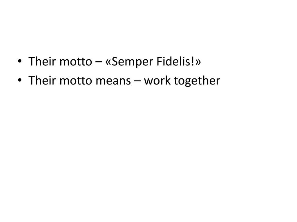 • Their motto – «Semper Fidelis!»• Their motto means – work together