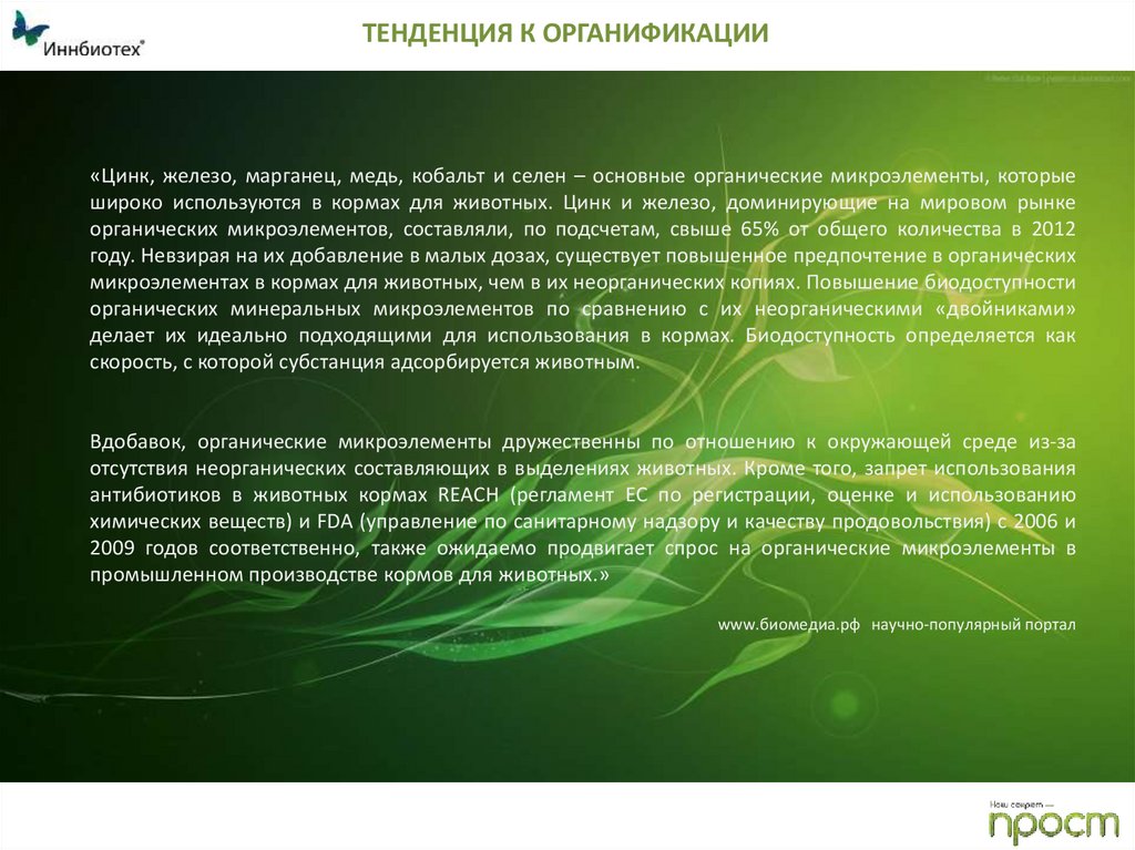 ТЕНДЕНЦИЯ К ОРГАНИФИКАЦИИ«Цинк, железо, марганец, медь, кобальт и селен – основные органические микроэлементы, которые
