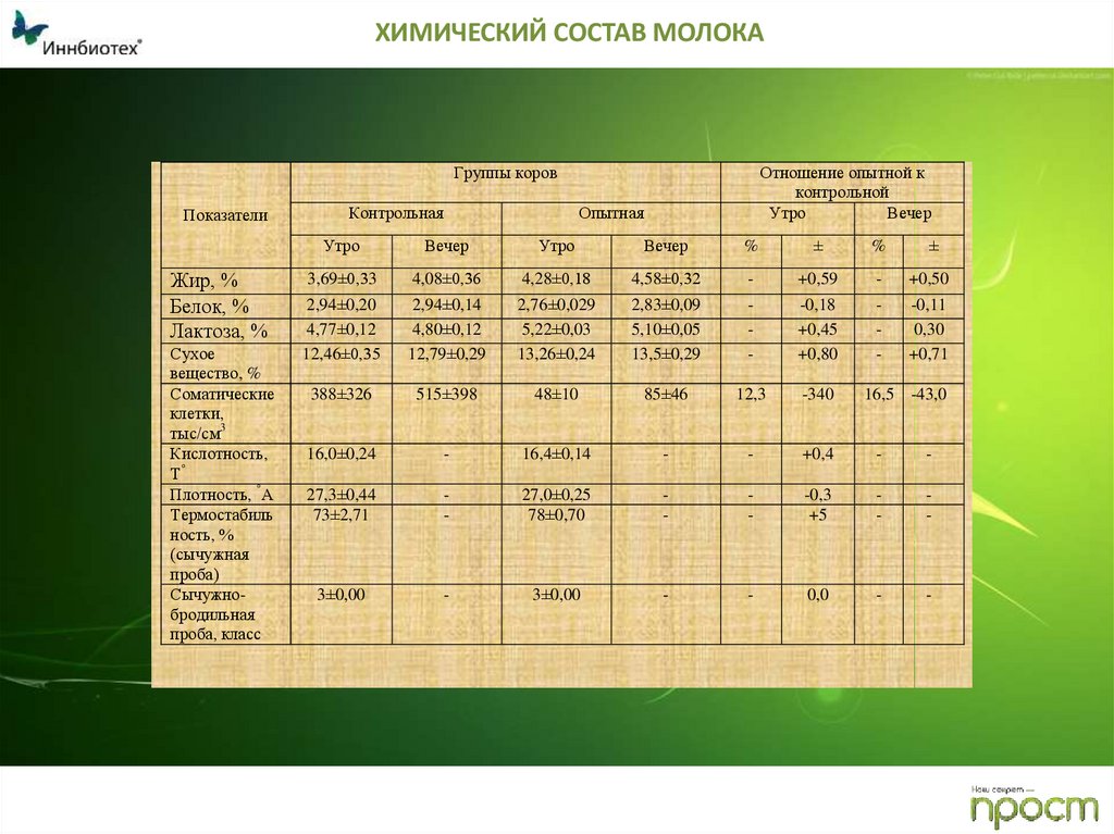 ХИМИЧЕСКИЙ СОСТАВ МОЛОКАОтношение опытной к