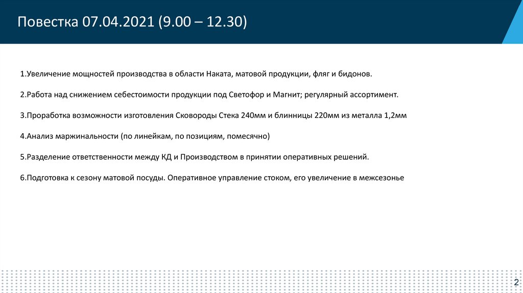 Повестка 07.04.2021 (9.00 – 12.30)1.Увеличение мощностей производства в области Наката, матовой продукции, фляг и бидонов.