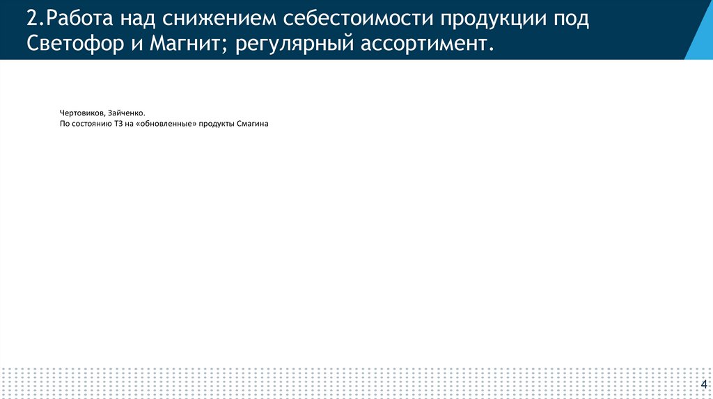 2.Работа над снижением себестоимости продукции подСветофор и Магнит; регулярный ассортимент.