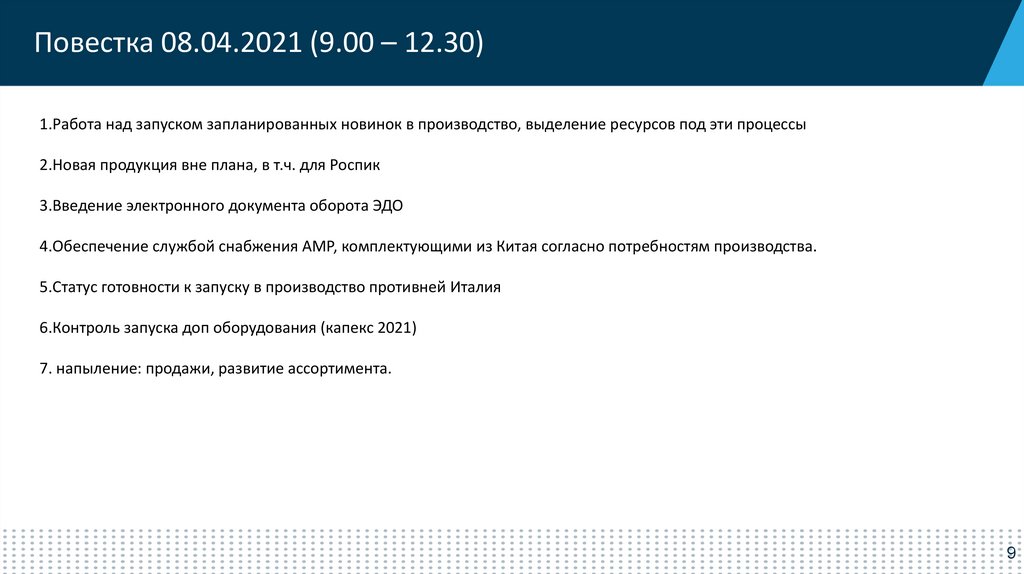 Повестка 08.04.2021 (9.00 – 12.30)1.Работа над запуском запланированных новинок в производство, выделение ресурсов под эти процессы