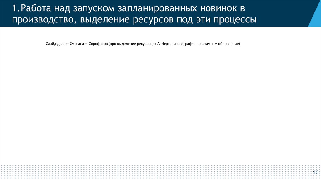 1.Работа над запуском запланированных новинок впроизводство, выделение ресурсов под эти процессы