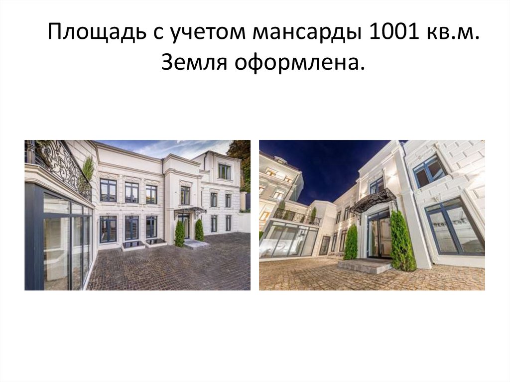 Площадь с учетом мансарды 1001 кв.м.Земля оформлена.