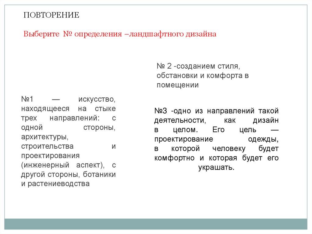 ПОВТОРЕНИЕВыберите № определения –ландшафтного дизайна