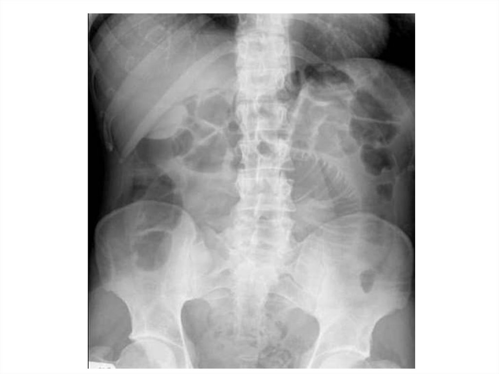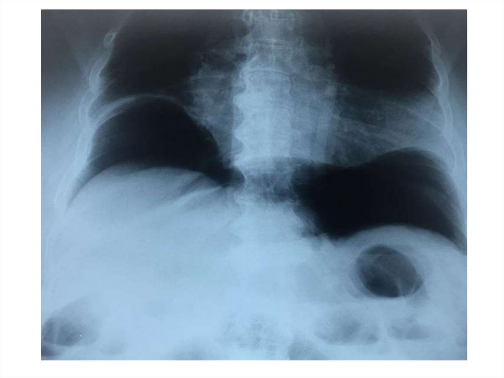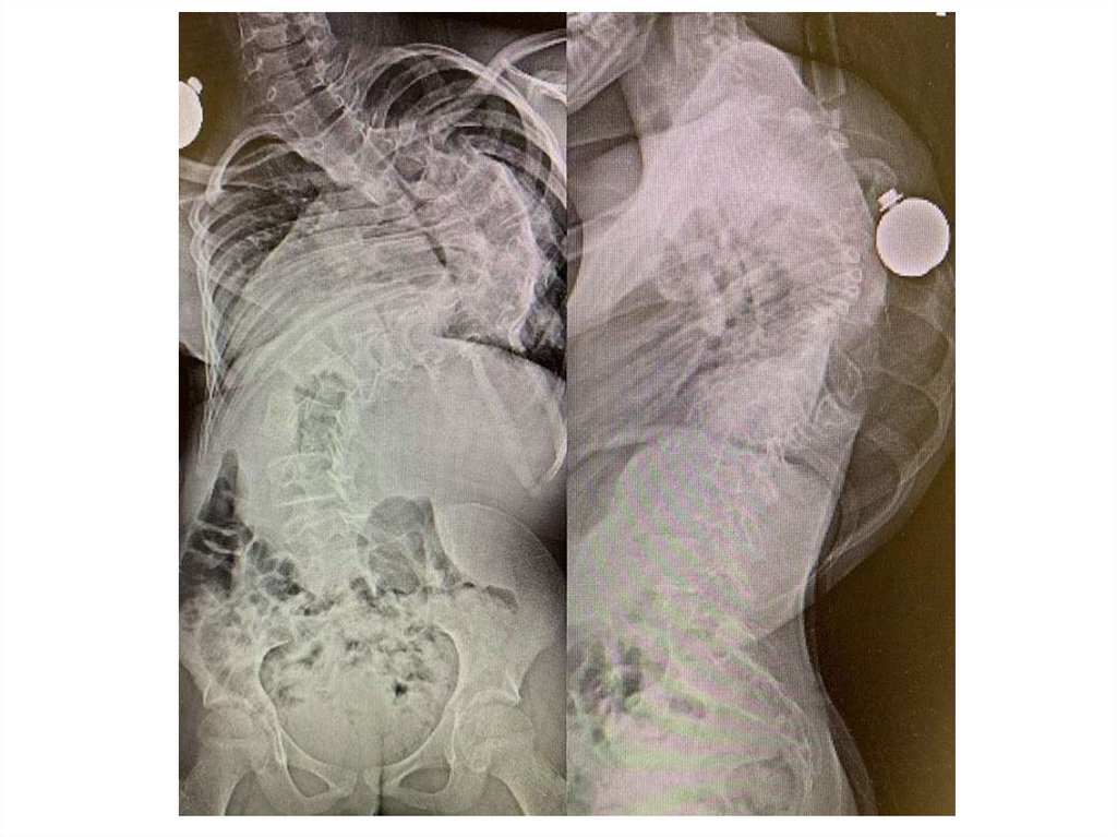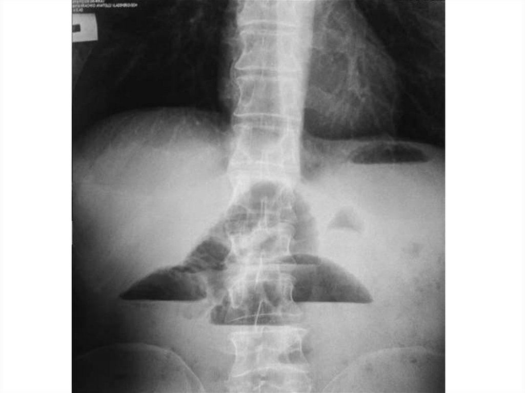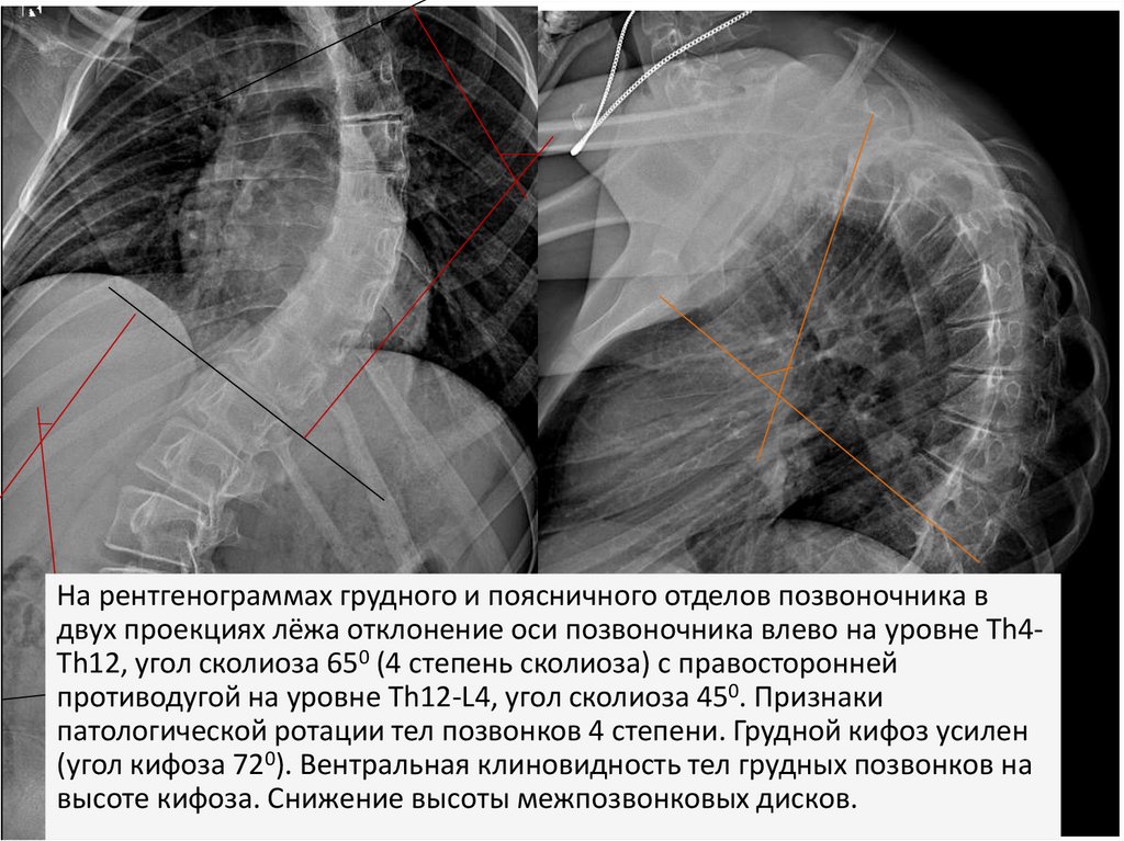 На рентгенограммах грудного и поясничного отделов позвоночника вдвух проекциях лёжа отклонение оси позвоночника влево на уровне Th4Th12, угол сколиоза 650 (4 степень сколиоза) с правосторонней
