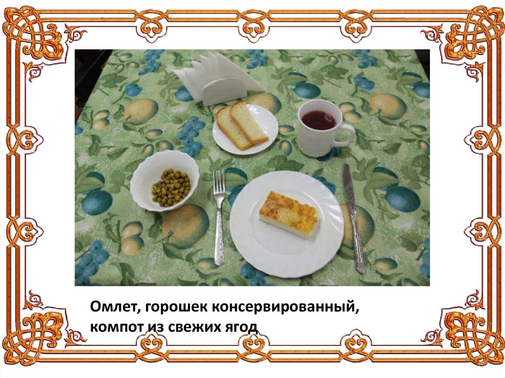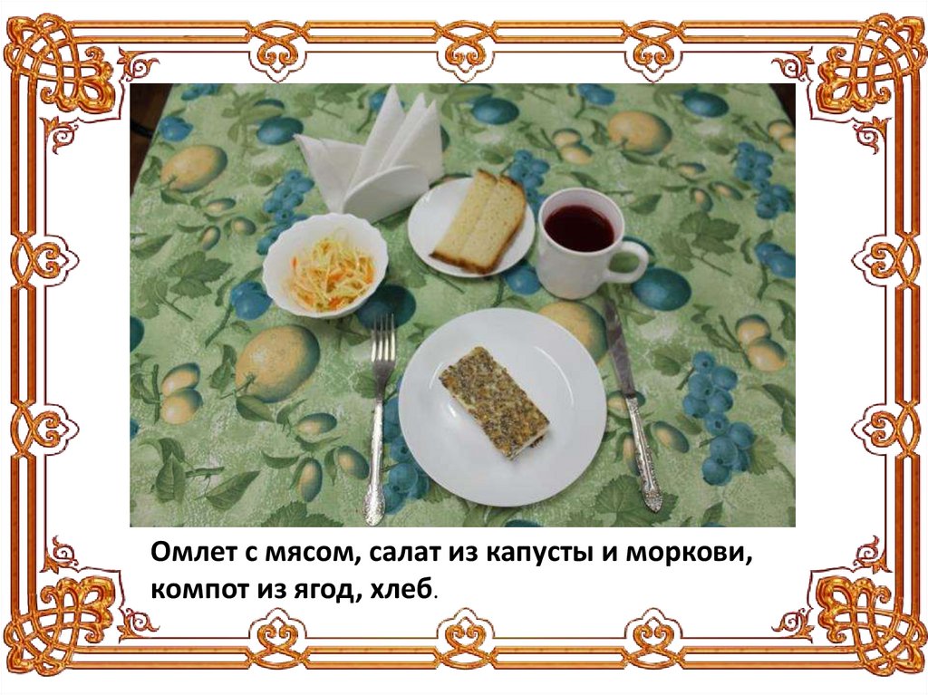 Омлет с мясом, салат из капусты и моркови,компот из ягод, хлеб.