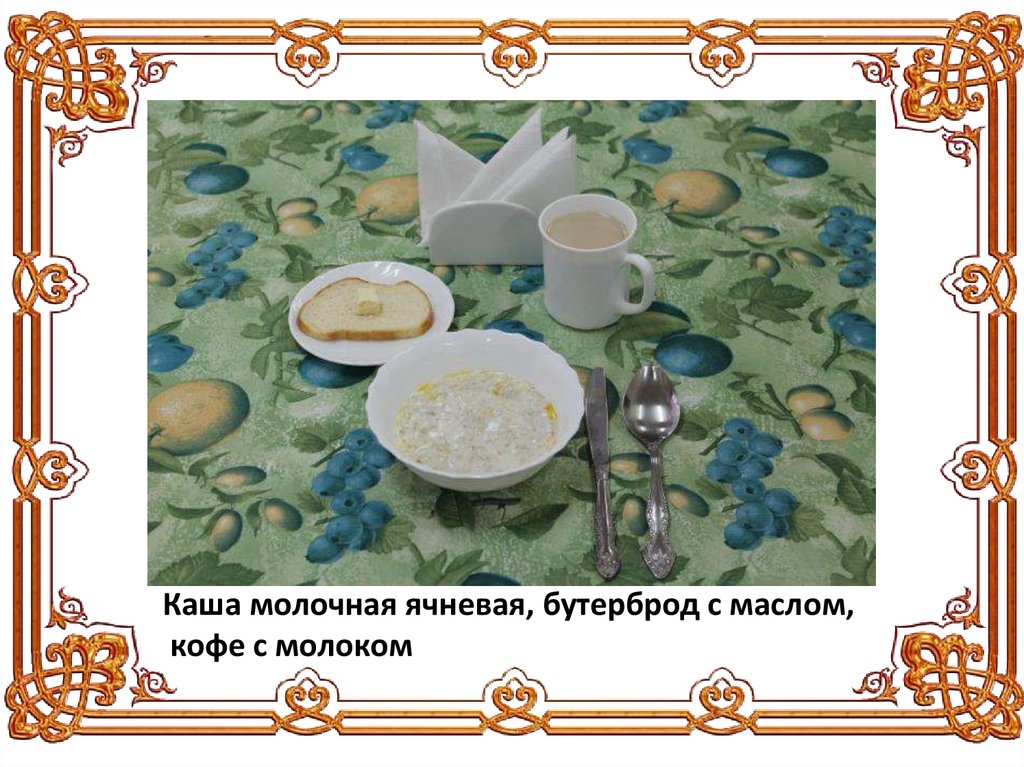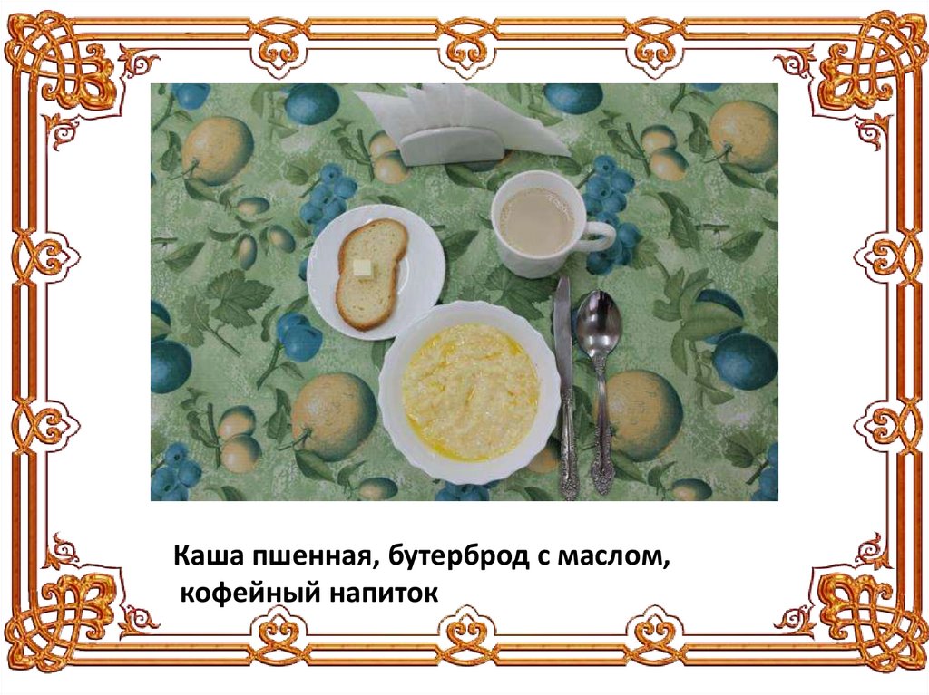 Каша пшенная, бутерброд с маслом,кофейный напиток