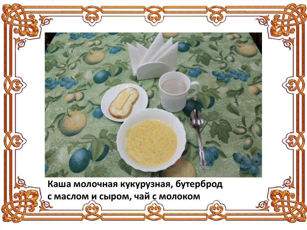 Каша молочная кукурузная, бутербродс маслом и сыром, чай с молоком